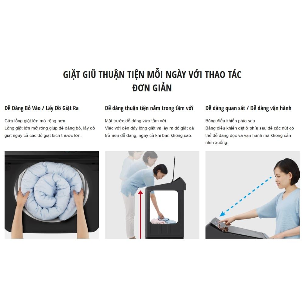 Bảng điều khiển được đặt ở vị trí phía sau thuận tiện, giúp người dùng dễ thao tác mà không bị mỏi cổ. Cùng với đó là 8 chương trình cơ bản gồm sấy gió, giặt tăng cường, giặt nhanh, giặt nhẹ, giặt thường, tiết kiệm nước, chăn màn, vệ sinh lồng giặt giúp đáp ứng các nhu cầu thường ngày.