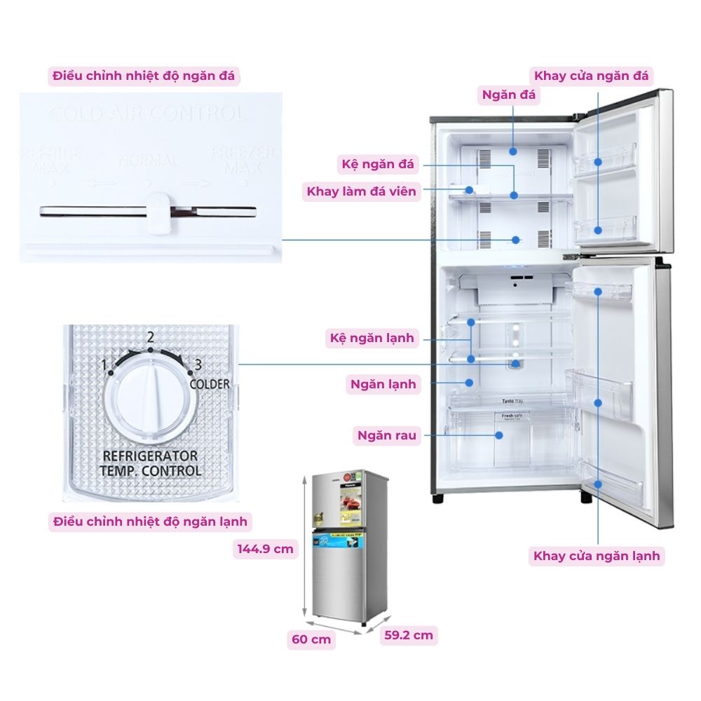 Tủ lạnh Panasonic ngăn đá trên có dung tích ngăn đá là 75 lít và ngăn lạnh là 159 lít, phù hợp cho lượng thực phẩm của gia đình nhỏ có từ 2 - 3 thành viên.